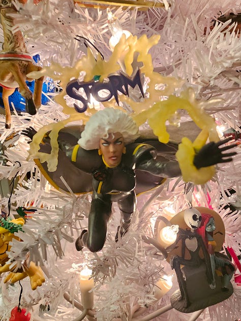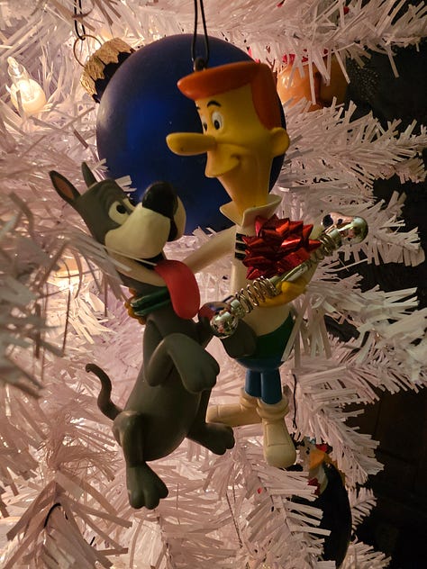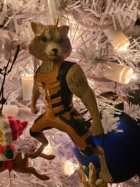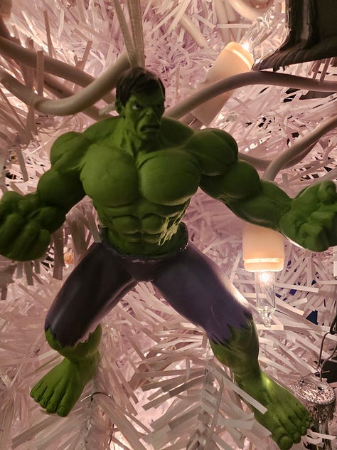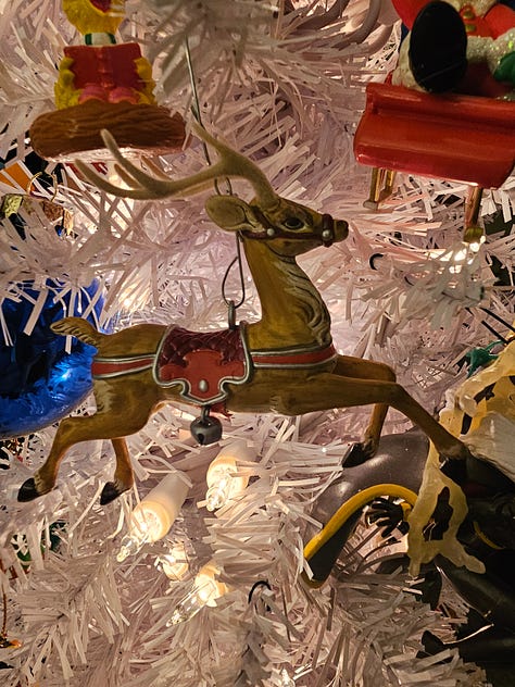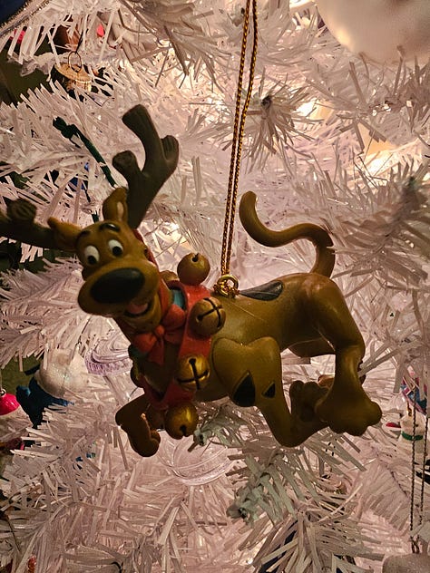 Below you will see a selection of closeups of some of the ornaments on my tree. These are mostly licensed characters, which are pricey. What I do is every year, after Christmas I grab new ornaments for 75% off. Other ones I find thrifting. The beautiful reindeer in the second set of photos was in a 2 pack for $5. They are Hallmark and retailed for about $30. I got another one (not shown) of mice in a golf bag for only $1.